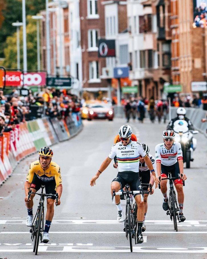 Wereldkampioen Julian Alaphilippe juichte te vroeg, Primoz Roglic kwam als eerste over de meet in Luik-Bastenaken-Luik. Foto: @jeredgruber, Instagram